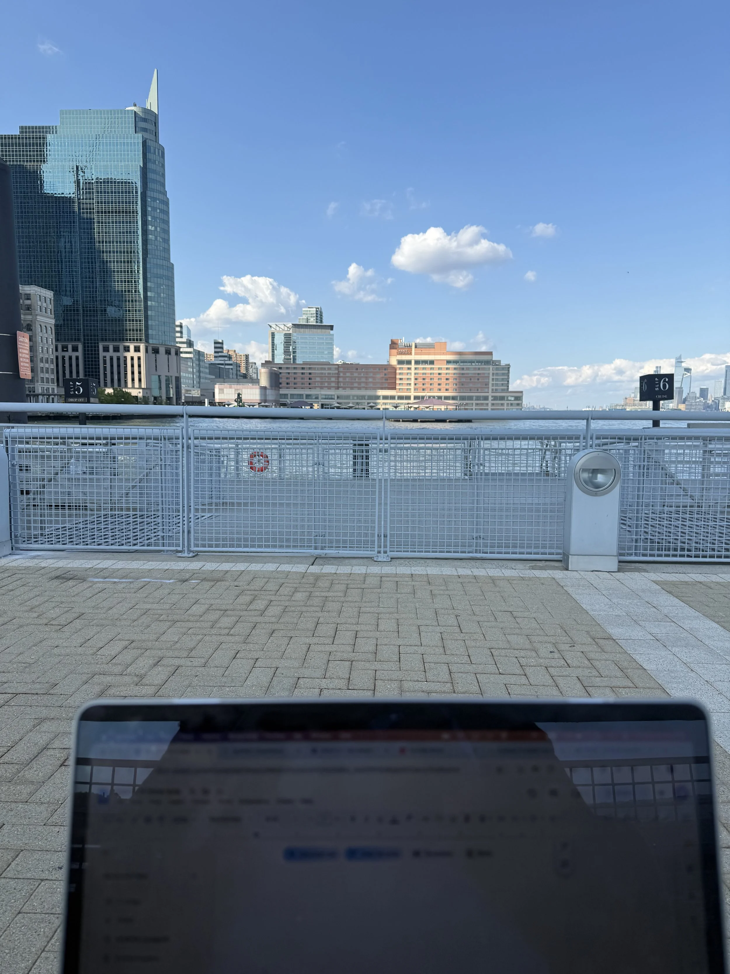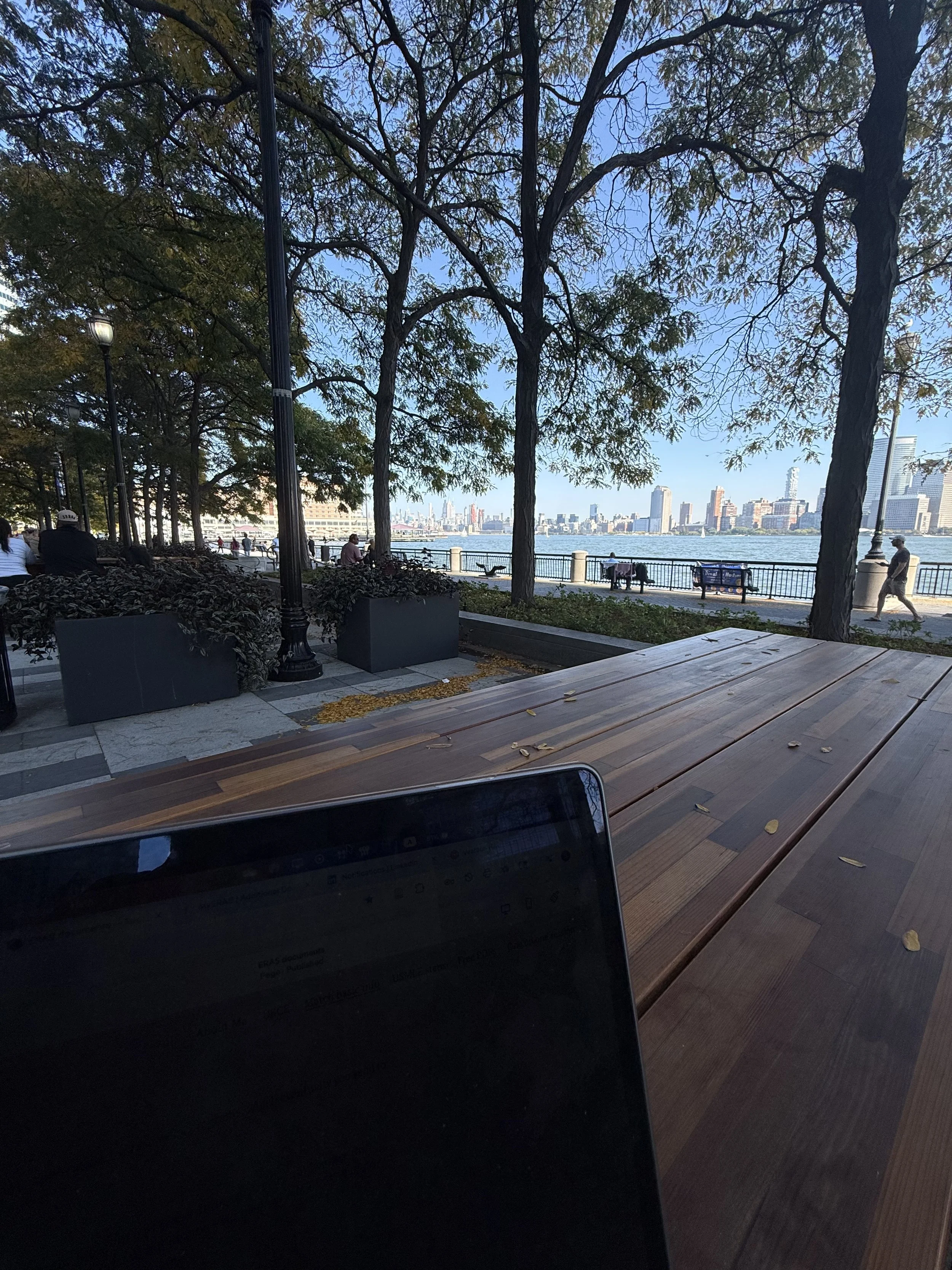 There is a nice place outside of the 70 Hudson St. building facing the river. You can find tables, chairs, and a slow breeze to work here.